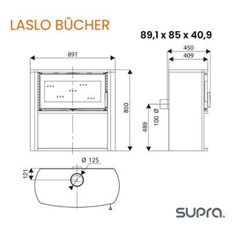 Poêle à bois Supra Laslo – modèle en acier de 7 kW, adapté pour chauffer jusqu’à environ 100 m². Sortie des fumées possible par le dessus ou l’arrière. Compatible avec les normes BBC et RT2012. Finition noire élégante.